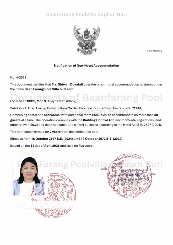 BaanFarang Pool Villa is a fully licensed and registered holiday resort, certified by Thai authorities. We meet strict safety and hygiene standards, with regular inspections and upgraded facilities including fire safety, life-saving equipment, and first aid. Your safety and comfort are our top priorities.